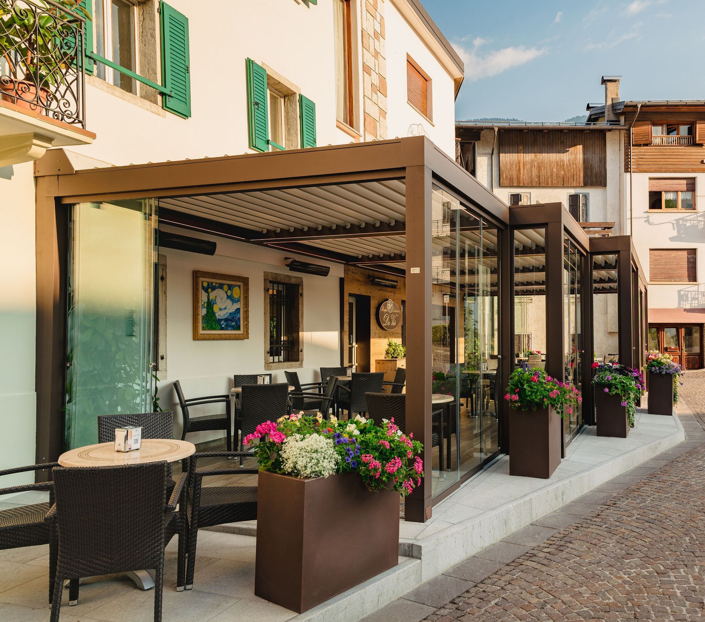 Opera, la acogedora zona exterior de la pastelería Da Vià, en Cadore (Pratic S.p.A.)