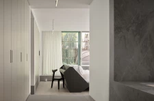 The bedroom is wrapped in glass and lined with a low granite plinth. While the plinth functions as connective thread between all areas of the suite, here it extrudes into a large stone slab on which the principal bathroom sits. A floor-to-ceiling glass shower and monolithic blue savoy stone bathtub float adjacent to the bedroom. A vanity and mirror, faceted like a sun collector, hangs on the north wall under a small clerestory window.