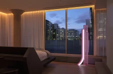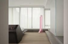 The entry to the principal suite follows a sweeping ceiling element into the penthouse’s northern half. A free-standing bed with an integrated desk, designed by Reflect and built by Toronto-based furniture designer Mary Ratcliffe, floats in the bedroom’s centre, surrounded by a Ceniza chair from EWE Studio in Mexico City and a pink Slide lamp by Marcelis.