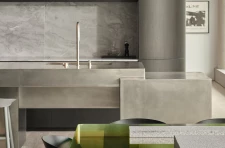 A kitchen island designed by Nicholas Schuybroek and manufactured by Obumex overlooks the residence’s shared living space. A sculptural arrangement of three tin blocks, the island was chosen for its resemblance to a deconstructed 80’s boombox.