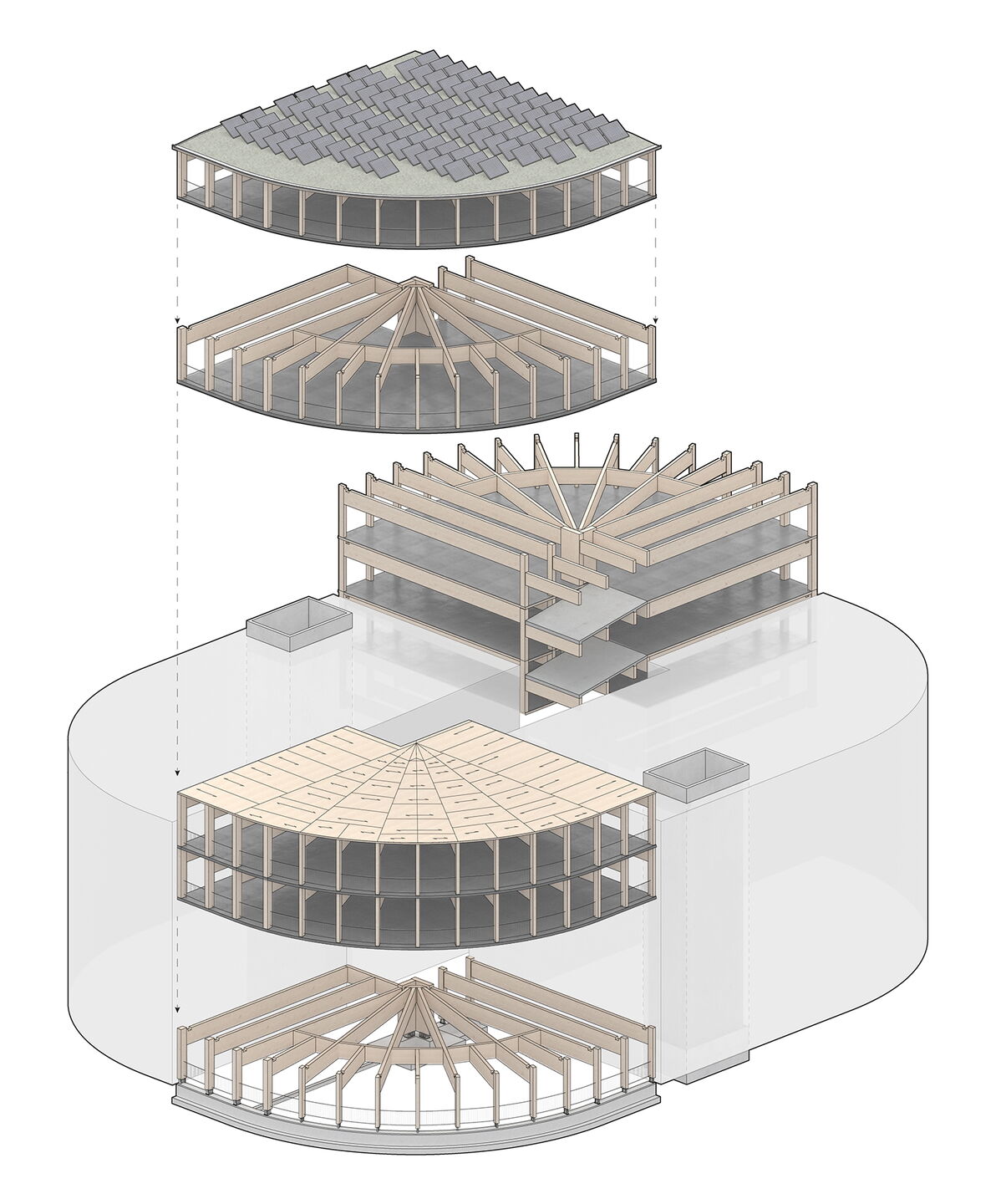 El aparcamiento de madera maciza está diseñado para su futura reconversión y reutilización (herrmann+bosch architekten)