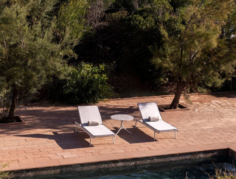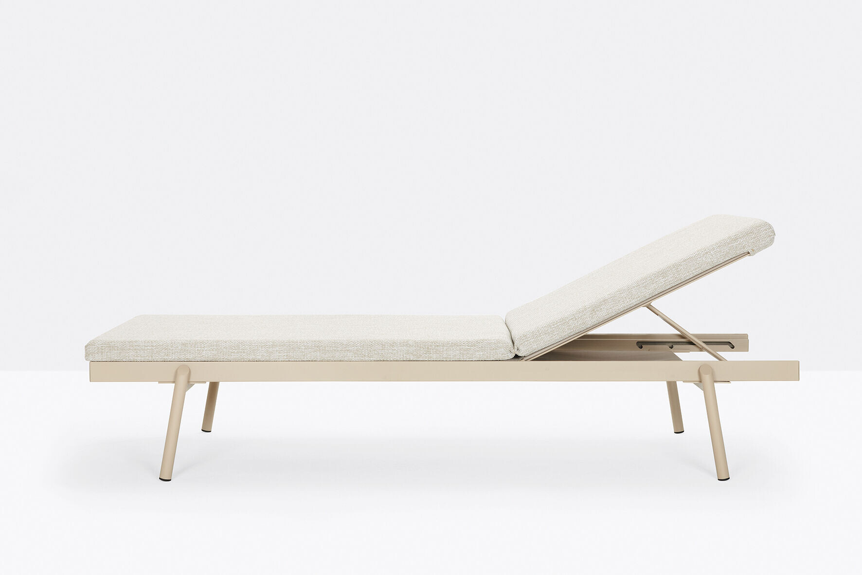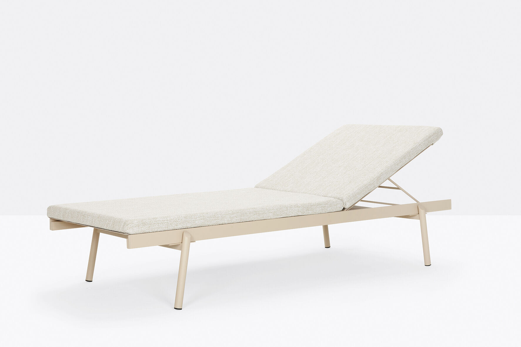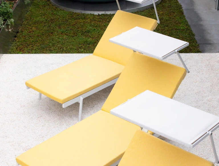 Rail is an outdoor sun lounger characterized by simple, modern lines and ideal for relaxing moments on the terrace, in the garden or by the pool. Its frame in powder coated aluminium has four angled legs in stainless steel featuring an oblique design. The seat and backrest are in textilene. The adjustable backrest may be raised to the most comfortable position, leaving space for a handy compartment. Also available the padded cushion in dry-feel foam upholstered in water-repellent UV-resistant fabric.